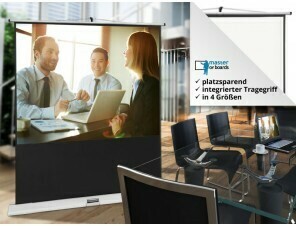 Für den leichten Transport hat die Leinwand einen integrierten Tragegriff und lässt sich platzsparend Aufbewahrung oder Transportieren. Außerdem ist die Beamerleinwand stufenlos höhenverstellbar und hat keine ausladenden Stativfüße.